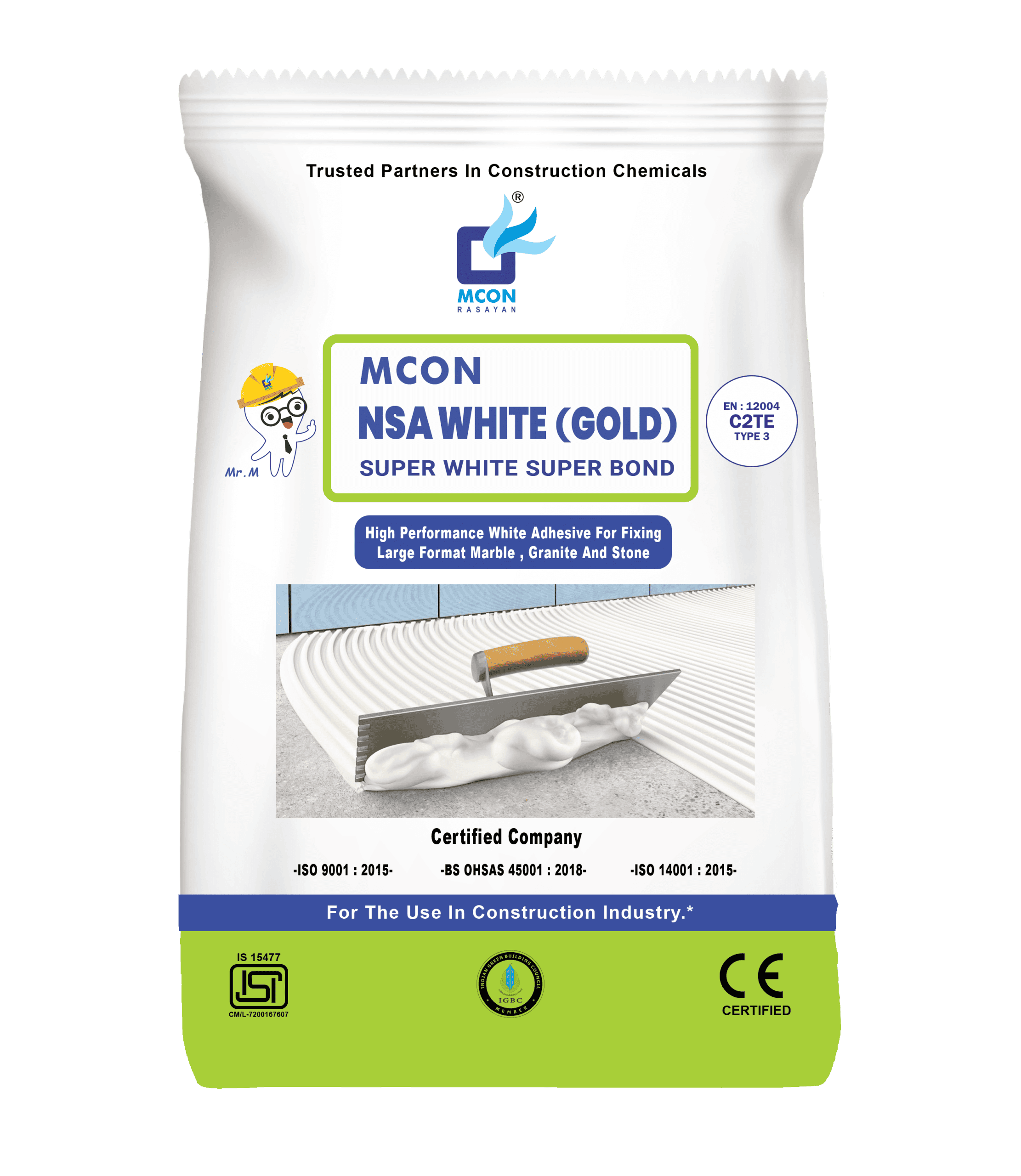 White, high polymer modified, cement-based wall and floor marble adhesive. NSA WHITE (GOLD) is suitable for fixing large format marble, granite and natural stones in interior and exterior situations, including swimming pools. MCON NSA WHITE is ideal for concrete, plaster and also tile substrates. It is an adhesive for the permanent fixing of Marbles and all type of tiles both in damp and submerged conditions.