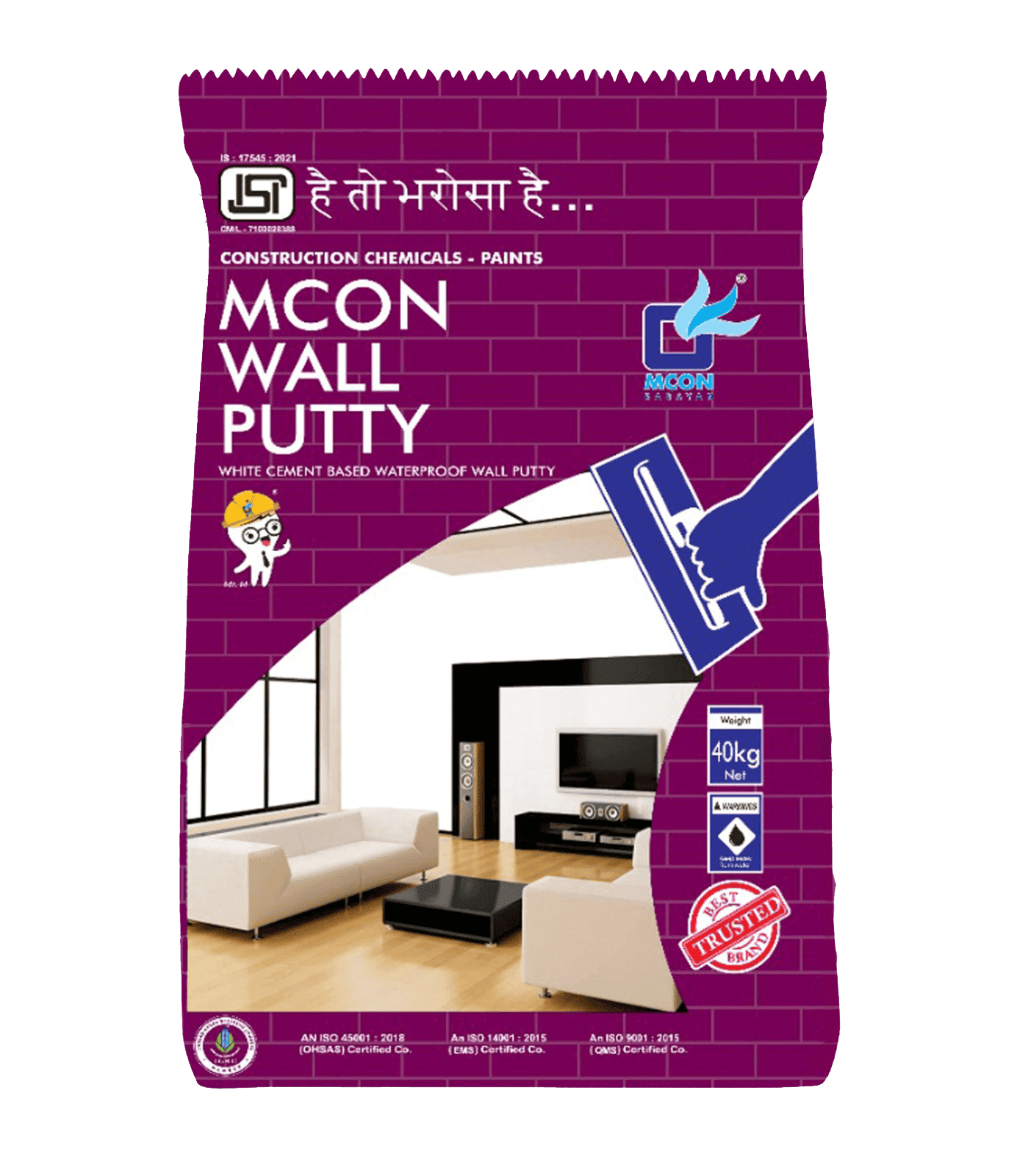 MCON WALL PUTTY is a white cement based, water resistant wall putty, which requires precise quantity of water to make a putty as an inert material for substrate. This is especially used to seal the pinholes and the blow holes getting exposed on concrete/plastered surfaces and to provide smooth even surface for next coating. It can be applied on internal and as well as external surfaces. It gives more adhesion strength and increase the life of paints.
